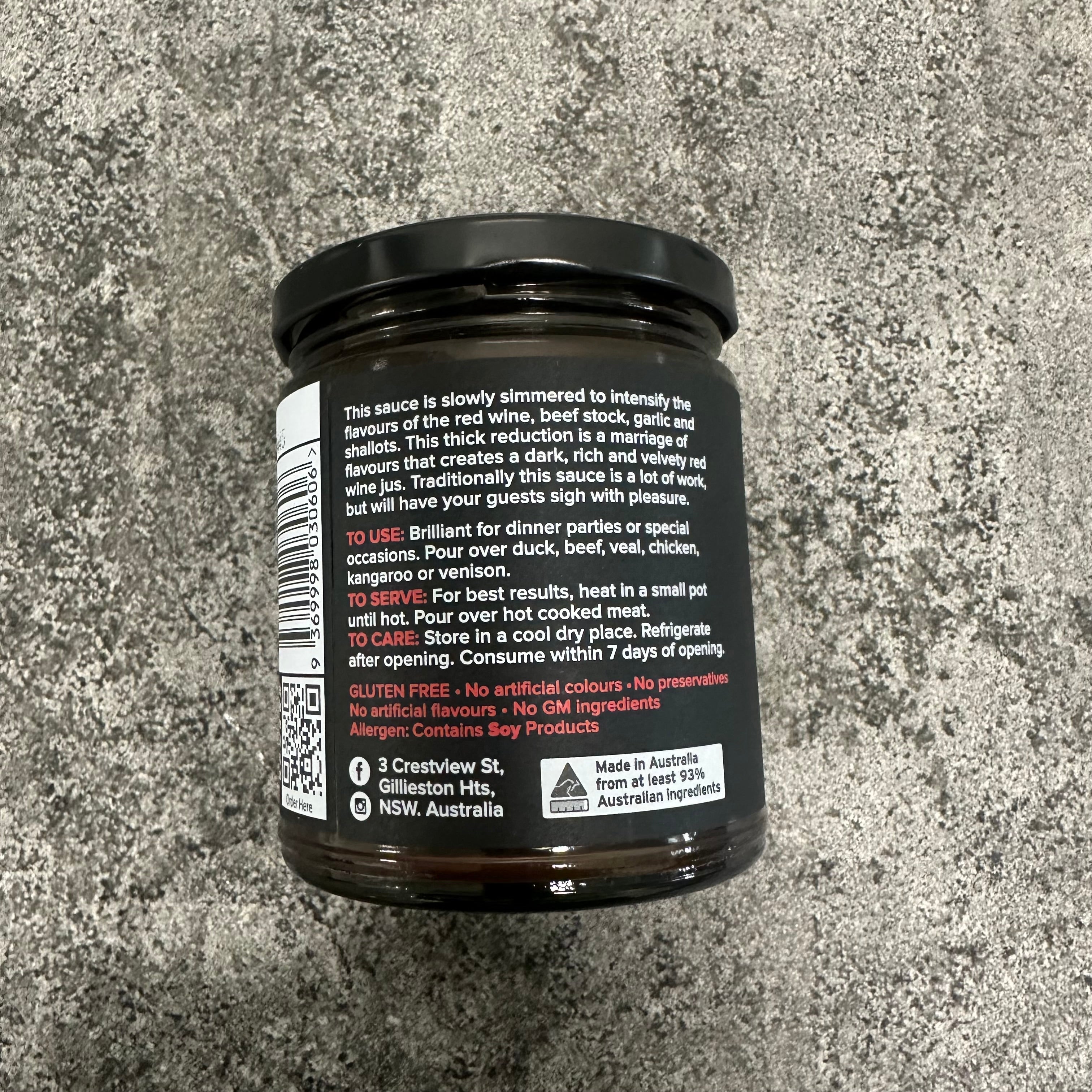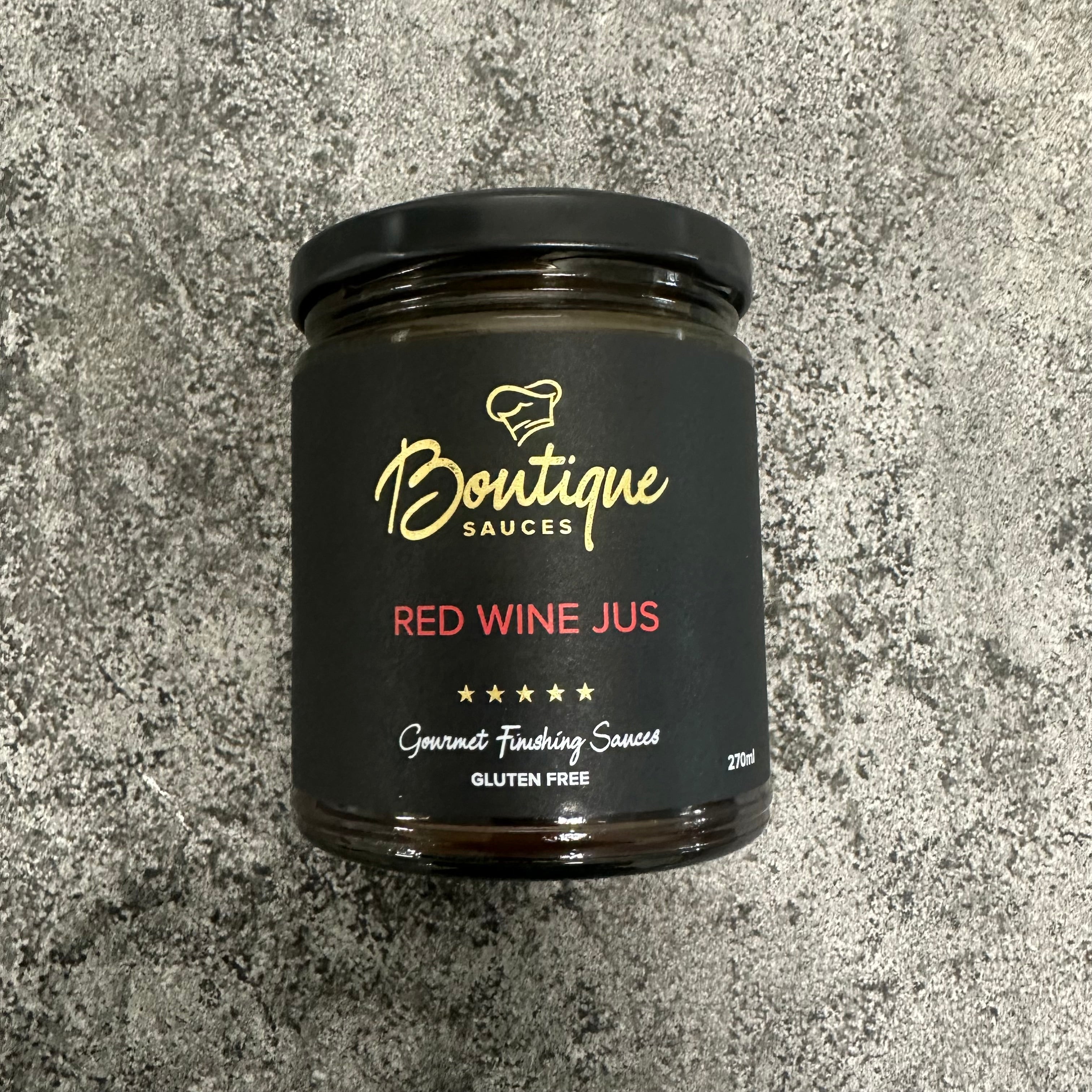 This sauce is slowly simmered to intensify the flavours of red wine, beef stock, garlic & shallots. This thick reduction is a marriage of flavours that creates a dark, rich and velvety Red Wine Jus.
